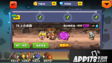 同时,挂机的英雄还能获得挂机的经验和技能书。难度越高的关卡,挂机获得经验越高。随着等级的提高,还能获得更多的英雄挂机位。