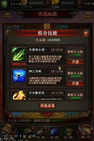 “组合技能”版本中加入《传世挂机》的六个经典组合技能为怒斩天下、天怒惊雷、天女散花咒、神之召唤、迷光烈焰以及火毒攻心剑。玩家在天元心法达到40级开启元神技能后可以使用组合技能,组合技能由本体释放,在元神附身后,玩家即可释放本体+附身元神的组合技能了。如本体是战士,在附身元神是战士时,可以释放的组合技能为怒斩天下。当附身元神更换为法师时,可以释放的组合技能就是迷光烈焰了。组合技能与普通技能一样,需要添加到技能队列中方可使用。
