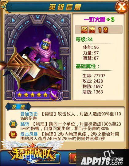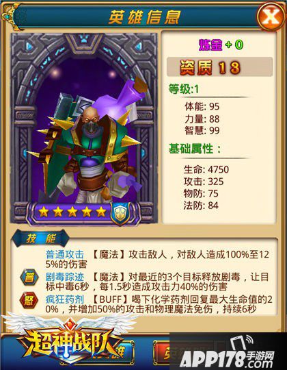 炼金:你很可能觉得炼金作为一个13资质的5星英雄不够给力吧?攻击不高,除了血厚,似乎没什么特色。但其实炼金是一个“润物细无声”的强力英雄!如果大家看一下战斗结算的话,就能发现炼金的输出并不低,这是因为他的技能超给力!炼金的普通技能“剧毒踪迹”可对3个目标下毒,每1.5秒造成40%的毒性伤害,而且这个技能炼金一上来就会释放,他的效果会缓慢浮现出来,要知道《超神战队》里毒性伤害不会增加中毒者的怒气,也就是说这些伤害不会转化为对方的大招释放出来,这无形之中削弱了对方实力!而他的怒气技能“疯狂药剂”可以立即回复生命值,并且增加50%的攻防,这个技能虽然没有爆发力,但是造成的伤害是持久的!慢慢把对手磨死,才是炼金的拿手好戏。