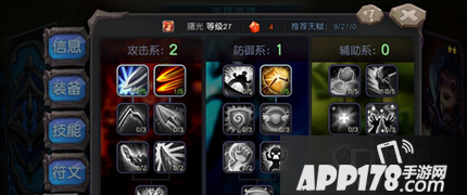 每位英雄都有3系天赋:攻击系、辅助系、防御系。每1系天赋都有4层,共21级,其中第21级的天赋特别强大。只有同一层的天赋全部点满后,才能开始点下一层天赋。