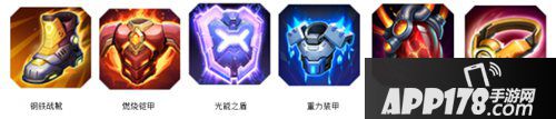 纯肉出装,以抗伤害保护输出为目的。在前期出一件燃烧战甲来贡献伤害,中后期就全肉出装,竟可能更高的叠防御生命属性。