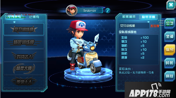 随后是称号界面,这里有个小Tips告诉大家:称号只要一旦获得,属性就一直存在并且不同称号的属性可以累加,并不会受到佩戴的影响,所以各位训练家们可以佩戴上自己喜欢的称号(注意,不同的称号拥有不同的绚丽特效)。同时在冒险的时候注意达成并收集称号哟~