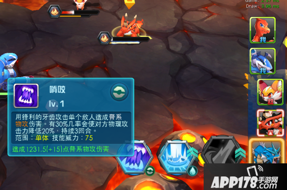 右下区域是行动顺序,图标靠左的为我方宠物,靠右为敌方宠物,行动顺序受到宠物速度影响,最下方的宠物即为当前行动的宠物。当我方行动时可以选择技能和目标进行攻击,如果技能属性对敌方宠物产生克制,则技能的属性上方也会出现伤害上升提示效果。除此之外,值得注意的是长按技能是可以看到技能介绍的,所以不用特别担心没记住哪个技能有什么用啦~、