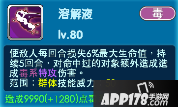 当亲密度达到二十级的时候-溶解液:使敌人每回合损失6%最大生命值,持续5回合,对命中过的对象额外造成造成毒系特攻伤害。属于群体技能,技能威力:50