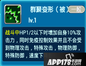 基格尔德被动技能【群聚变形】战斗中当HP1/2以下时增加自身10%攻击力,同时免疫控制效果并且不会受到物理攻击,特殊攻击,物理防御,特殊防御,速度下降影响。这个被动技能如果能够触发,可以使基格尔德获得超高的攻击力!
