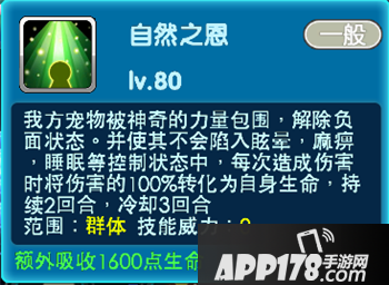 雪拉比这只宠物简直万金油和谁都能搭配起来!【治愈愿望】驱散我方宠物所有异常状态,回复20%生命值,并施加一层守护护盾。【自然之恩】我方宠物被神奇的力量保卫,解除负面状态。并使不会陷入眩晕,麻痹,睡眠等控制状态中,每次造成伤害的100%转化为自身生命,持续2回合,冷却3回合。能够保证全体血量!