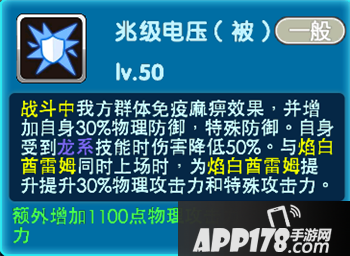 当亲密度达到三十级的时候-兆级电压:战斗中我方群体免疫麻痹效果,并增加自身30%物理防御,特殊防御。自身受到龙系技能时伤害降低50%。与焰白酋雷姆同时上场时,为焰白酋雷姆提升30%物理攻击力和特殊攻击力。属于被动技能。