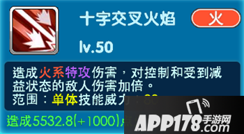 初始技能-十字交叉火焰:造成火系特攻伤害,对控制和受到减益状态的敌人伤害加倍。属于单体技能,技能威力80。