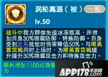 当亲密度达到三十级的时候-涡轮高温:我方群体免疫冰冻效果,并增加自身30%物理防御,特殊防御。自身受到龙系技能时伤害降低50%。与暗黑酋雷姆同时上场时,为暗黑酋雷姆提升30%物理攻击力和特殊攻击力。属于被动技能。