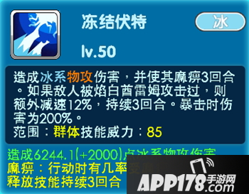 当亲密度达到五级的时候-冻结伏特:造成冰系物攻伤害并减速10%,持续3回合。如果敌人被焰白酋雷姆攻击过,则额外受到100%伤害。暴击时伤害为200%。属于群体技能,技能威力85。