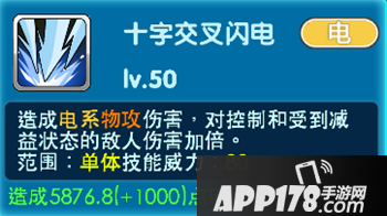 初始技能-十字交叉闪电:造成火系特攻伤害,对控制和受到减益状态的敌人伤害加倍。。属于单体技能,技能威力80。