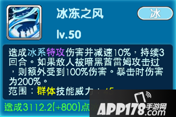 冰冻之风:造成冰系特攻伤害并减速10%,持续3回合。如果敌人被暗黑酋雷姆攻击过,则额外受到100%伤害。暴击时伤害为200%。