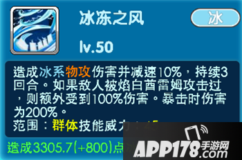 冰冻之风:造成冰系物攻伤害并减速10%,持续3回合。如果敌人被焰白酋雷姆攻击过,则额外受到100%伤害。暴击时伤害为200%。