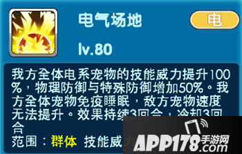电系宠物的技能威力提升100%,物理防御与特殊防御增加50%,所以在选择宠物搭配方面,各位训练师尽可能的选择电系宠物,能让电气场地的技能效果达到最大!