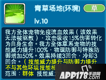 卡璞哞哞的【青草场地】能够使我方全体宠物免疫流血效果(该效果无法被驱散),攻击吸收15%伤害转化为自身生命。我方全体草系宠物的技能威力提升100%,物理防御与特殊防御增加50%。大大提高毕力吉翁的防御力与战斗力