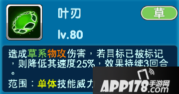 初始技能-叶刃:造成草系物攻伤害,若目标已被标记,则降低其速度25%,效果持续3回合。属于单体技能,技能威力75。