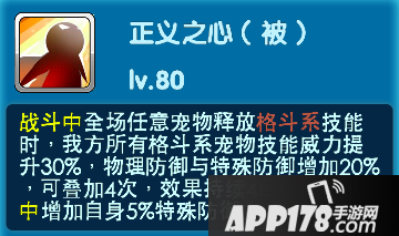 当亲密度达到三十级的时候-正义之心:战斗中全场任意宠物释放格斗系技能时,我方所有格斗系宠物技能威力提升30%,物理防御与特殊防御增加20%,可叠加4次,效果持续4回合。战斗中增加自身5%特殊防御力。属于被动技能。