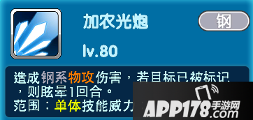 初始技能-加农光炮:造成钢系物攻伤害,若目标已被标记,则眩晕1回合。属于单体技能,技能威力75。