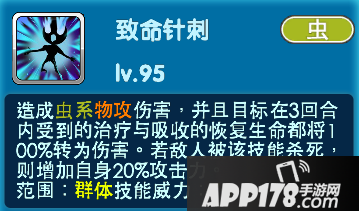 吸血这个技能刺不刺激,惊不惊喜?当然这只是一道开胃小菜而已,小丘需要着重介绍的是这个技能!【致命针刺】能够攻击敌方全部宠物,不光能够让对方全体3回合内受到的治疗与吸收的恢复生命都将100%转为伤害!若能杀死敌人则额外增加自身20%的攻击!单体已经足够恶心对手了,现在又来一个全体,小丘相信对手看到爆肌蚊后会头疼不已