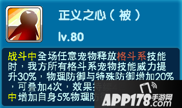 当亲密度达到三十级的时候-正义之心:战斗中全场任意宠物释放格斗系技能时,我方所有格斗系宠物技能威力提升30%,物理防御与特殊防御增加20%,可叠加4次,效果持续4回合。战斗中增加自身5%物理防御力。属于被动技能。