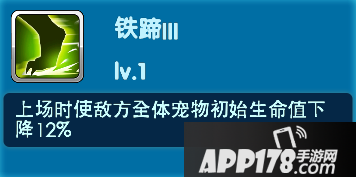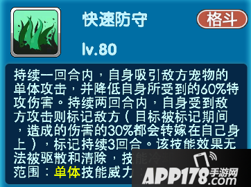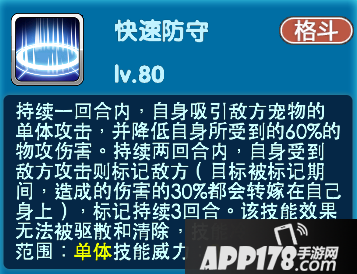当亲密度达到十级的时候-快速防守:持续一回合内,自身吸引敌方宠物的单体攻击,并降低自身所受到的60%的物攻伤害。持续两回合内,自身受到敌方攻击则标记敌方(目标被标记期间,造成的伤害的30%都会转嫁在自己身上),标记持续3回合。该技能效果无法被驱散和清除,技能冷却3回合。属于单体技能,技能威力0。