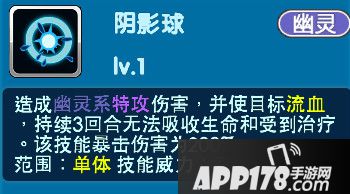 初始技能-阴影球:造成幽灵系特攻伤害,并使目标流血,持续3回合无法吸收生命和受到治疗。该技能暴击伤害为200%。范围:单体 技能威力:75