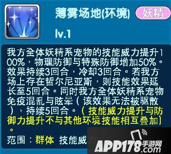 卡璞鳍鳍环境技能[薄雾场地]我方全体妖精系宠物的技能威力提升100%,物理防御与特殊防御增加50%。效果持续3回合,冷却3回合。若我方场上存在哲尔尼亚斯,则技能效果延长至5回合。同时我方全体妖精系宠物免疫混乱与眩晕。(该效果无法被驱散),持续5回合。阵容选择妖精系队伍的训练师们另外一只宠物也可以搭配哲尔尼亚斯,薄雾场地所提供的buff效果会更全面。