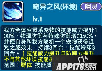 始源骑拉帝纳环境技能[奇异之风]我方幽灵系宠物的技能威力提升100%,物理防御与特殊防御增加50%,并使自身和我方随机一个宠物获得诅咒之躯效果,持续3回合。技能冷却3回合。