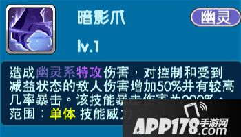 当亲密度达到五级时解锁-暗影爪:造成幽灵系特攻伤害,对控制和受到减益状态的敌人伤害增加50%并有较高几率暴击。该技能暴击伤害为200%。范围:单体 技能威力:125