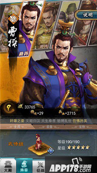 反之,武侍姬的天赋是提高本队武将的基础气血和闪避,减少伤害值,那么就要将其和曹操、刘备等防御型武将搭配在一起,使这些武将的生存能力更加顽强,确保本队的持续输出能力。