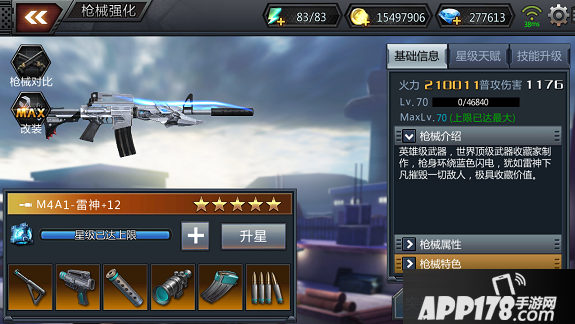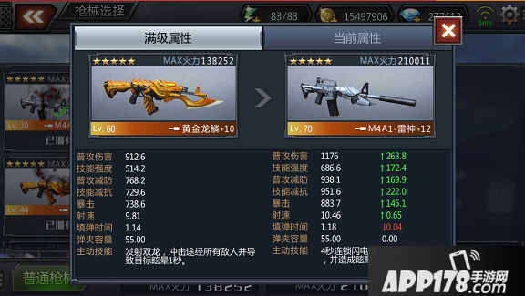 属性上M4A1雷神比之前版本最强的冲锋枪黄金龙鳞有了大幅提高。几乎所有的属性都提高了20%左右,而