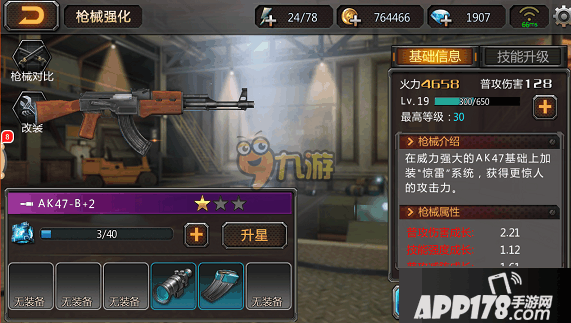 AK47初始就是紫色B级品质的枪械,继续进行养成最终可培养为SS级的枪械。达到规定的等级和突破次数后,就能用合金改装钳进行改装。改装后武器的各项属性会得到质的飞跃,同时也能解锁新技能。