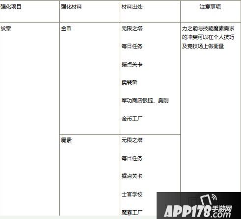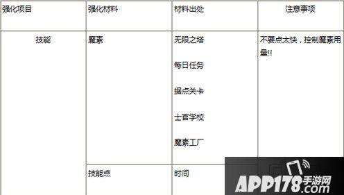 另外,随着等级的上升,特殊的技能也会随之开放,到25等时所有的技能都会开启,但要继续点高仍有等级限制,技能消耗魔素及技能点数,技能点数会自动恢复,而魔素则是由关卡、教官或工厂中取得,因为魔素消耗量非常的大,都是1点几万在用的所以要谨慎使用。