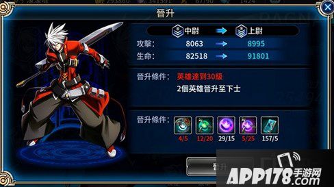 晋升是将角色攻击和生命强化的项目之一,有点类似其他游戏在升星级的概念,随着角色达到指定的等级和收集到相对应的精魄,军阶也会跟着上升,不过到后期除了精魄也会需要英雄卡这类的物品,因此在此建议玩家决定好要专精练哪只角色,否则角色全开了,军阶升不上去就糗大囉。
