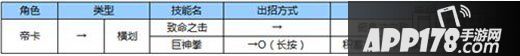 《苍翼之刃》中,根据起手操作的不同,英雄技能可分为点击、上划、横划、下划、冲刺、特殊六大类型,具体技能效果因英雄而异。以下为“赤鬼”帝卡的出招表(操作说明:O为点击屏幕,>为方向键,↑为上划,↓为下划,→为横划):