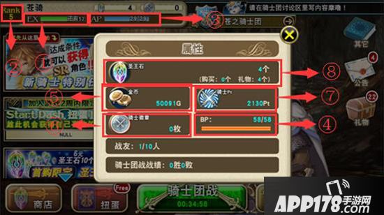 ⑧圣王石:充值或礼物,通关特定副本或打败特定敌人、完成特定任务等可获得的道具;除了在商店购买道具、抽取扭蛋获得卡牌外,恢复AP和继续副本时也可使用。