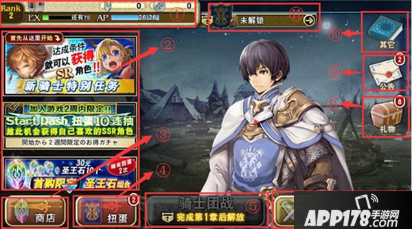 ②滚动条幅:包括新骑士特别任务、邀请限定、新章节预告以及各类活动均可从此处进入。