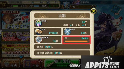 AP相当于一般游戏的“体力”,推图刷本都需要AP值。游戏中,AP值每5分钟增加一点,加入骑士团后,每隔一段时间,可以点击城堡旁边的雕像获得AP值。