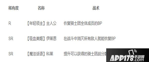 上述【年轻领主】主人公和【吸血美姬】伊莱恩都是骑士团战中重要的BP恢复手段之一,用处也非常大。