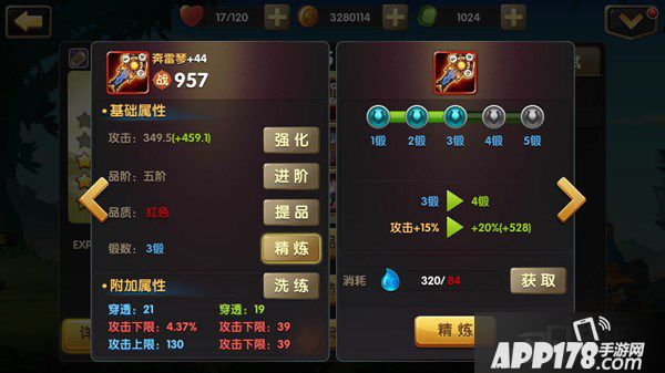 主公达到40级以后,就将开启装备精炼。通过分解多余的材料,可以获得精炼所需的精华。精炼将对该装备的核心属性进行加成(如武器精炼提升攻击力,鞋子精炼提升生命等)。