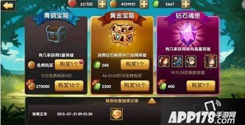 宝箱中一共分青铜,黄金,钻石三种。青铜每天免费抽取5次,可以产出各种道具和英雄碎片;黄金每2天免费抽取一次,有几率可以抽取成品英雄;钻石魂匣应该是VIP才开启的,有很多神将都是产出这里,魂匣每3天更新一次英雄。建议玩家碰到自己中意的英雄再下手吧。