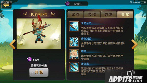 接下来就是最重要的兵种了——长矛兵。克制骑兵象兵,而且免疫击退。他是打到后面的副本的主力兵种。张飞释放技能后长矛兵会觉醒,攻击附带毒性。打黄巾入侵,张飞+长矛兵,基本顺利通关。