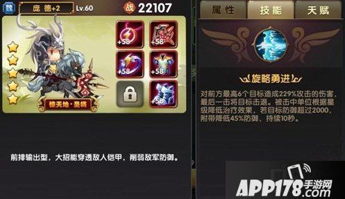 庞德,这个武将比较冷门,缺点是不怎么能抗,天赋里的暴击如果能改成加血或减伤就好了。不过技能减防御的效果比较不错,因为后期前排中排武将都有2000+的防御,庞德减一半防御还是很给力的。