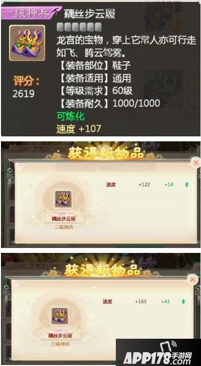 下面直接来看下一级到五级神兵数值,数值那是爆表,1级神兵OS鞋子为敏+107.4级达到205,5级直接敏+250。没打宝石的4级的数值已经超过与二阶仙器鞋子数值(二阶仙器敏鞋子没打满宝石为170)