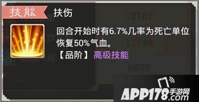 扶伤技能,较低的几率使得很多玩家并不看好这款高级技能,不过既然它被分类到高级技能里,自然有它突出的地方——每回合开始。每回合开始时有几率复活死亡单位。战斗时打着打着,突然你就从地上站了起来,伸手招出龙马、浪淘沙一顿拍,把敌方拍的七零八落的,这叫什么?这就叫翻盘。
