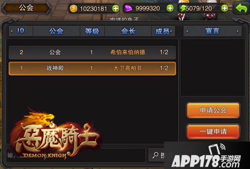 打开公会界面,系统将随机刷新20个未满员公会名单,可上下滑动显示,向下拖拽可再次刷新20个名单,选择其中一个点击【申请】即向该公会发送申请信息,该公会便显示“已申请”。或者可以点击一键申请, 即同时向列表中前面20个公会发布申请信息。另外也可以在搜索中输入确定公会名称或ID,点击搜索,然后点击申请加入。
