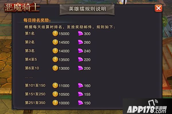 参加英雄擂的所有玩家都有每日奖励,排名前350名更有钻石大礼!下图奖励为暂定奖励,以游戏内实际情况为准。