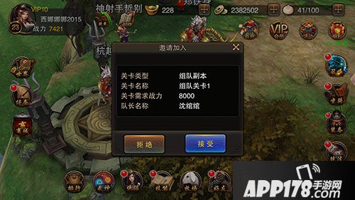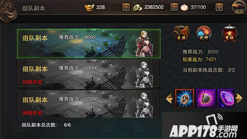 游戏中目前一共设有5个组队副本,选择组团副本时,可以依据自身战力选择。第一副本:8000战力;第二副本:10000战力;第三副本:12000战力;第四副本:14000战力;第五副本:16000战力。