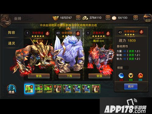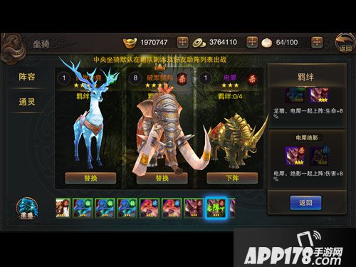 游戏中点击下方菜单的“阵容”按钮即可进入坐骑阵容界面。选择你想要出战的坐骑替换即可。而中央坐骑默认会在组队副本及好友助战列表中出战。如果你想要炫耀自己的超凡神兽,就要把它设置在中央位置哦!
