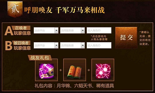 当然,在贺岁公测中,《刀锋无双》也给主公们准备了惊喜活动与壕礼!一个人的战役免不了孤单,万人跨服战有小伙伴才热血!贺岁公测期间,《刀锋无双》推出呼朋唤友活动,召唤你从前并肩作战如今却不见踪影的好兄弟,只要TA回来,你就有可能获得奖励礼包!月华锦、六韬天书和稀有道具全囊括!另外,微博上的转发抽奖赢小米4、微信上的全民拼图大礼包和官方贴吧上的踩楼送好礼活动也将全线开启,缤纷奖励不容错过!七天以上未登录的主公活动期间回归更可直接领取热血回归礼包哦!